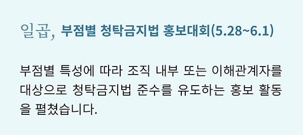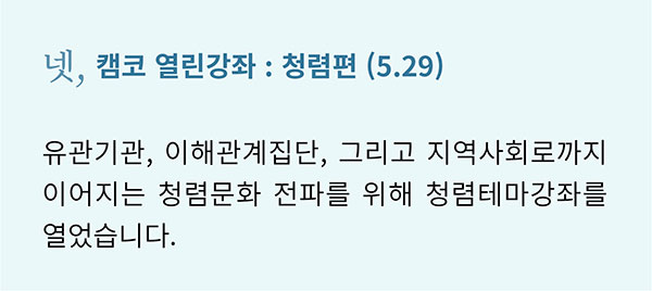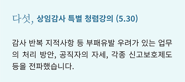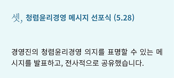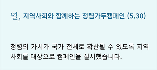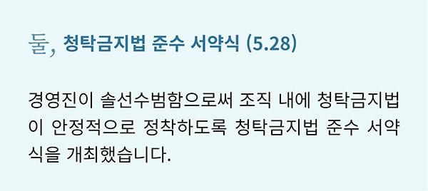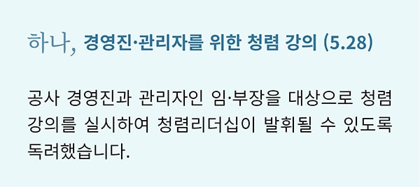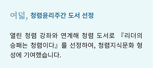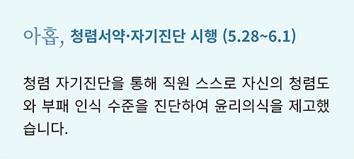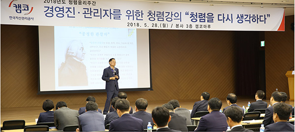 대한민국을 뜨겁게 달군 지난 6.13 지방선거에서도 ‘청렴’은 큰 화두였습니다. 그만큼 ‘청렴’은 시대와 장소를 막론하고 공직자에게 특히나 중요하게 강조되는 덕목입니다. 캠코도 마찬가지입니다. 캠코는 국민권익위원회에서 지정한 ‘기업윤리의 날(6.2)’을 포함한 ‘청렴윤리주간’에 청렴문화 정착을 위한 다양한 활동을 펼쳤습니다.
