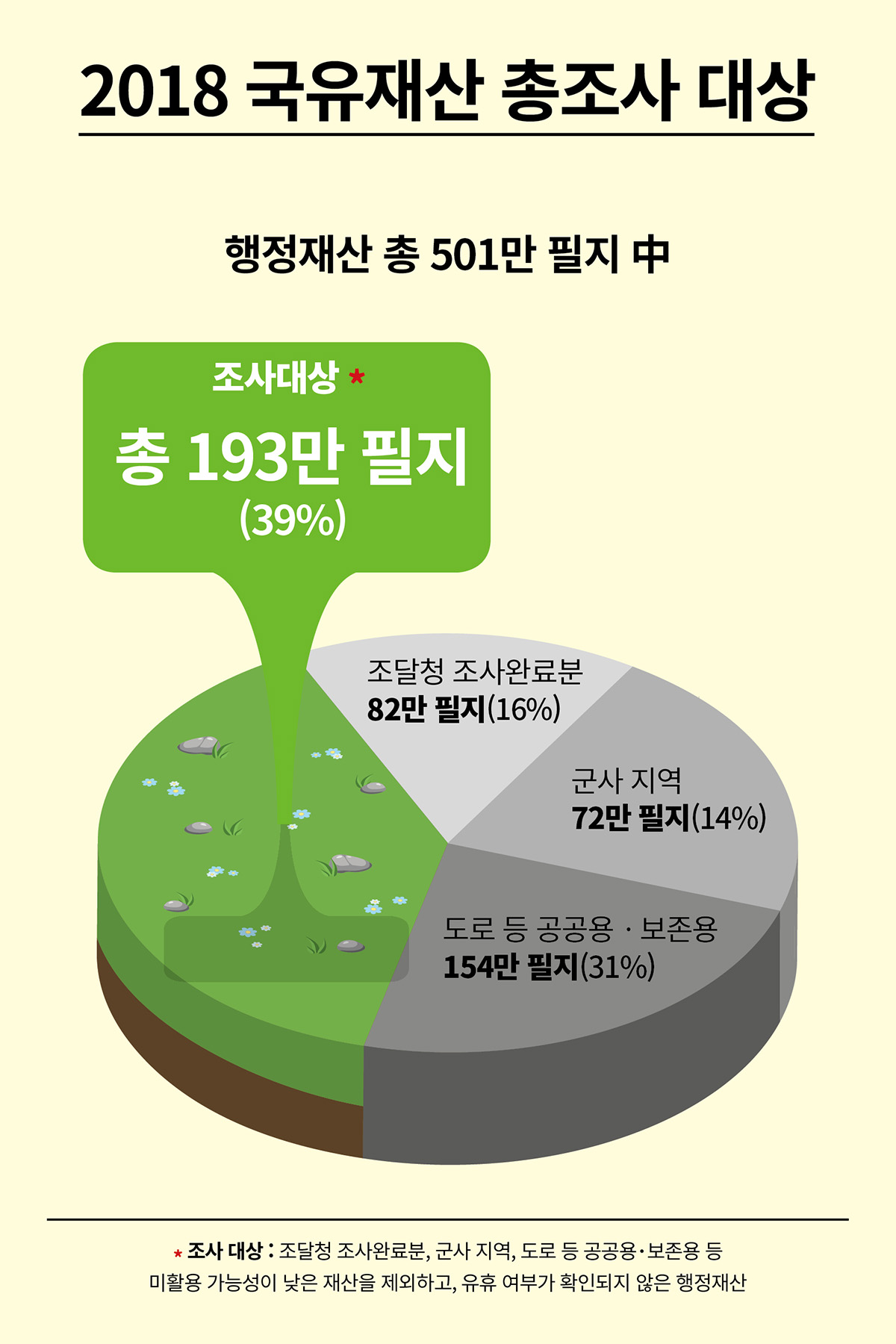 이번「2018 국유재산 총조사」는 그동안 부분적으로 실시되었던 각 중앙관서 소관의 행정재산의 유휴·미활용 여부를 전체적으로 확인하고 점검하는 최초의 전수조사로, 행정목적 활용 여부, 활용 유형, 지목 등의 6개 항목을 상세히 다루고 있습니다. 접근이 용이한 지역(136만 필지)은 지리에 가장 능통한 지역 주민이 직접 조사하고, 그 외 지역(57만 필지)은 드론으로 대체하여 직접 조사가 어려웠던 사각지대까지 해소했습니다. 조사 결과, 행정 목적으로 사용할 계획은 없지만 활용 가능성이 높은 재산은 대부(임대) 및 개발(토지·건축개발) 등을 통해 새로운 모습으로 변모할 수 있도록 지원할 계획입니다.