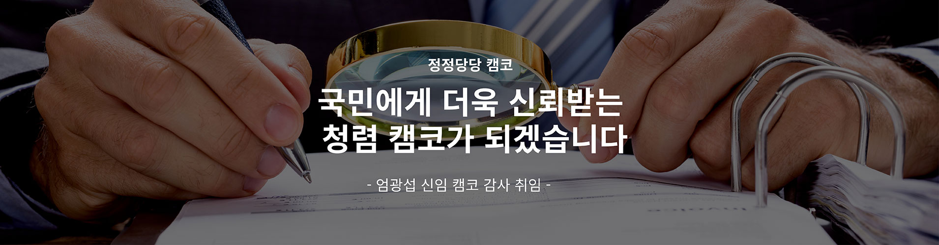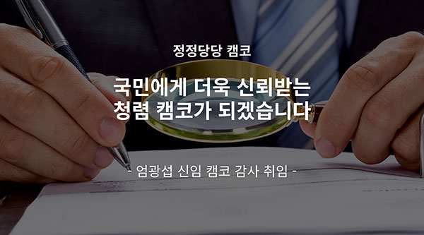 엄광섭 신임 감사를 필두로 캠코는 앞으로도 현장 중심의 감사 활동, 선진화·체계화된 감사시스템 구축 등을 통해 국민으로부터 더욱 사랑받는 투명하고 청렴한 금융공기업이 되도록 노력하겠습니다.