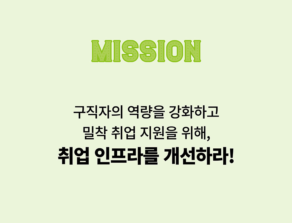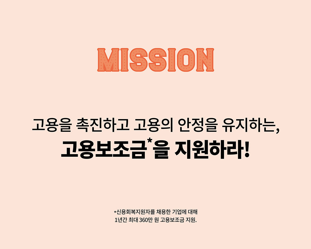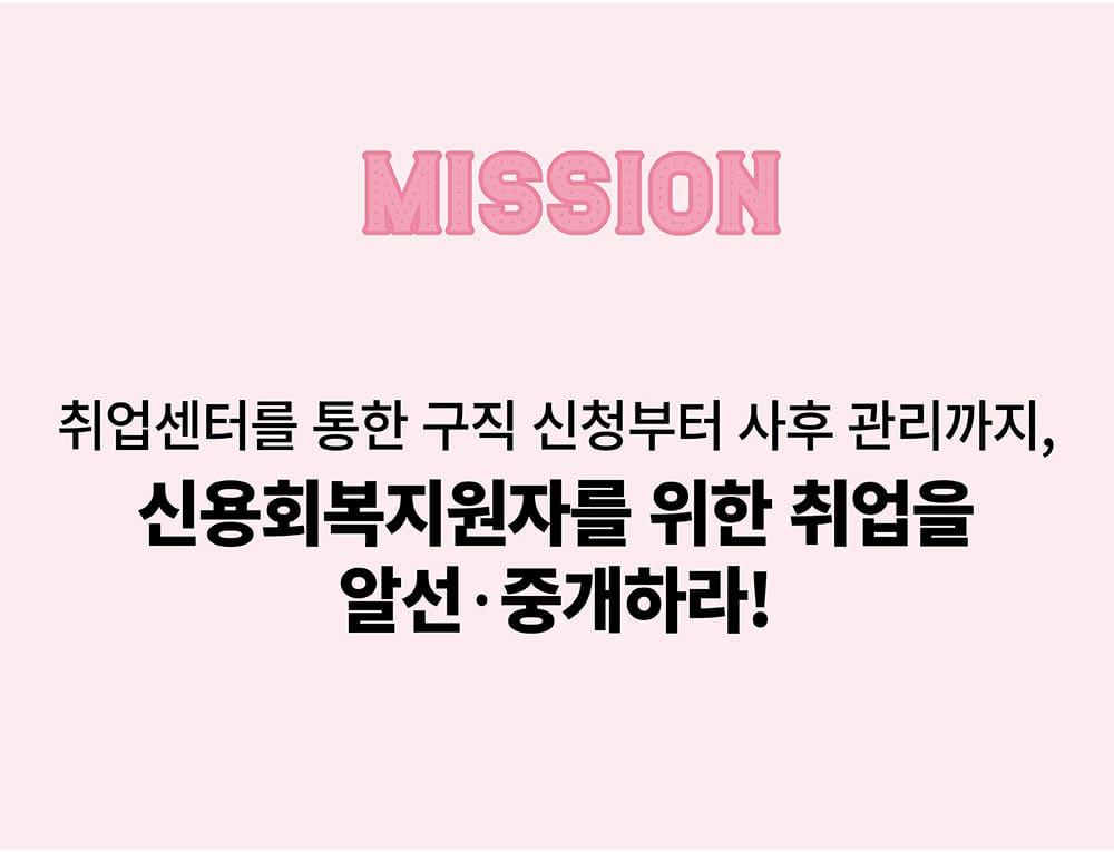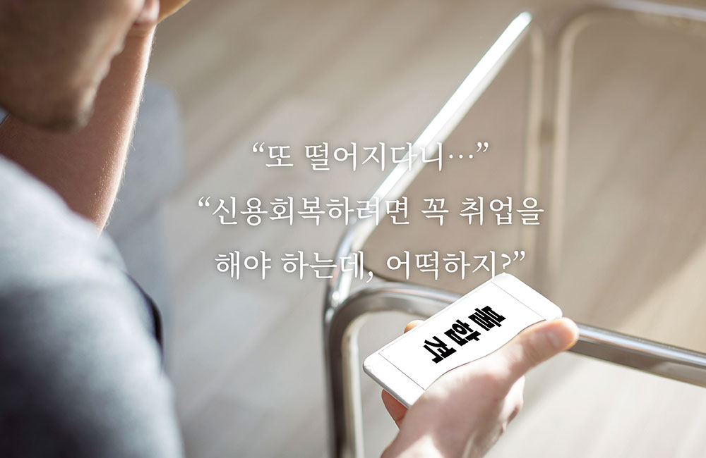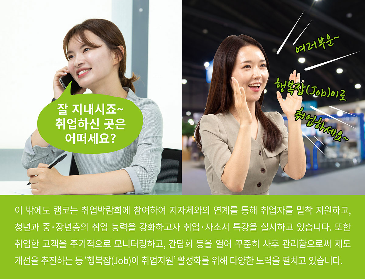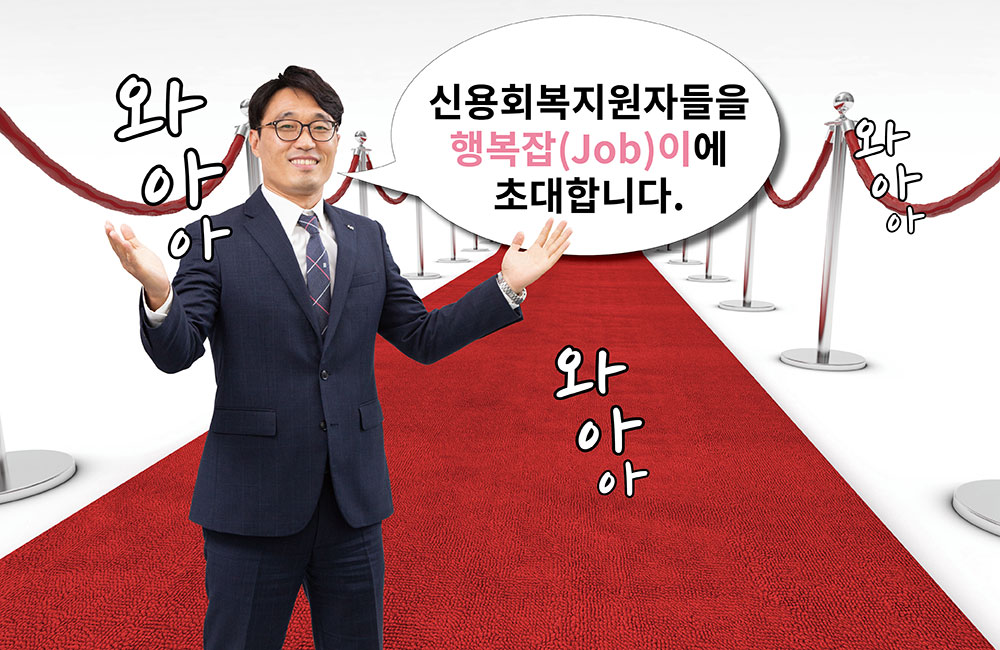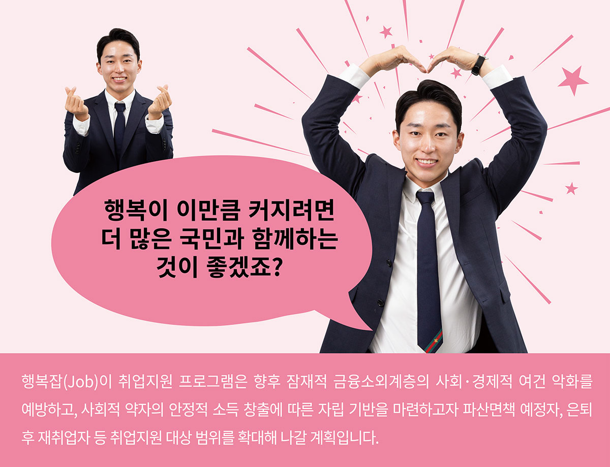 캠코 가계자활지원부 취업지원팀은 「금융채무불이행자 취업지원 방안」에 따라 국가정책사업의 일환으로 정기적인 소득이 없어 신용회복에 어려움을 겪는 신용회복지원자의 취업지원을 수행합니다. 행복잡(Job)이 취업지원 프로그램을 통해 구직자와 구인기업을 상호 알선∙중개하는 한편, 경비, 청소, 요양보호 등 행복잡(Job)이 취업자들의 주요 직종 특성을 고려해 사회적기업과의 취업 연계 또한 도모하고 있습니다. 채용기업에는 고용보조금을 지급하여 고용을 촉진하고, 취업자에게는 모니터링 실시, 간담회 개최 등 지속적인 사후관리로 근로 의욕을 제고합니다. 앞으로 취업지원팀은 행복잡(Job)이 취업지원 프로그램의 대상을 파산 면책 예정자, 은퇴 후 재취업희망자 등 잠재적 금융소외계층으로 더욱 확대하여, 취업취약계층의 사회∙경제적 추락을 미연에 방지할 수 있도록 역량을 집중해 나갈 계획입니다.