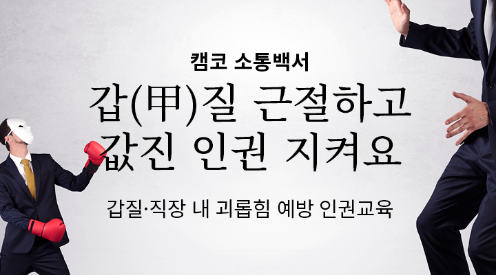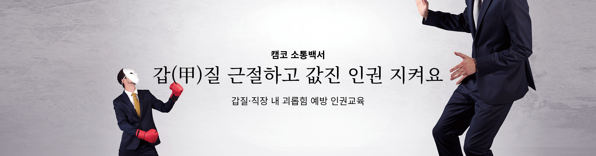 기업 오너 일가의 폭언 등이 연달아 이슈화 되면서 직장 내 괴롭힘이 심각한 사회 문제로 부각되었습니다. 뉴욕 타임즈가 우리나라 기업 오너 일가의 폭언 사건 등을 소개하며 ‘갑질(gapjil)’이라는 우리말을 번역하지 않고 그대로 인용하며 부끄러운 우리 사회의 단면을 보여주기도 하였는데요. 직장인의 70% 내외가 피해 경험을 밝혔을 정도(2017년 국가인권위원회 조사)로 갑질은 효율적 조직관리라는 이름으로 우리 사회에 만연해 있습니다. 직장 내 괴롭힘을 금지하는 개정 근로기준법이 지난 7월부터 시행되면서 ‘상식의 문제’였던 기업 문화가 이제는 ‘법적 문제’가 되었는데요. 성숙한 기업문화가 정착하기를 기대하며 캠코는 전 직원 ‘갑질·직장 내 괴롭힘 예방 인권교육’
