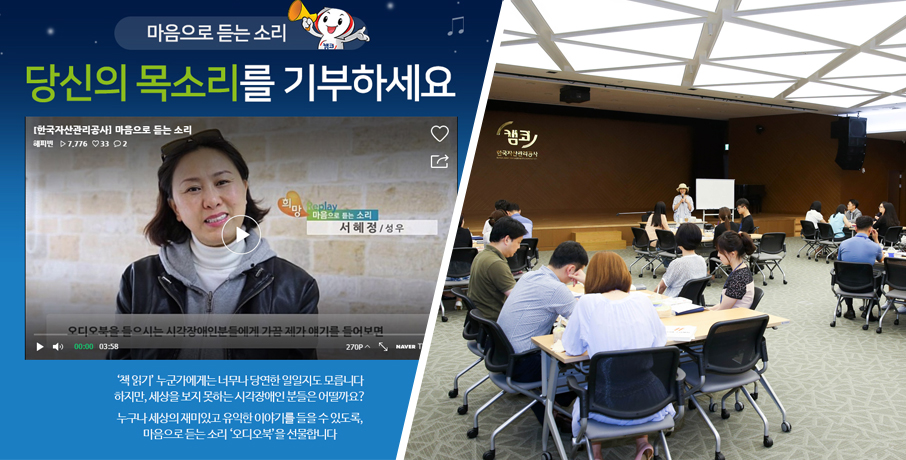 따뜻한 마음과 열정으로 목소리를 모아준 캠코인과 봉사자분들 덕분에 캠코의 사랑은 더 크고 따뜻해졌습니다. 일반인 목소리 기부자와 함께 앞으로도 더욱 완성도 있는 캠코, 앞으로도 목소리 재능기부를 통해 시각장애인을 위한 오디오북 <마음으로 듣는 소리> 제작을 지속적으로 추진해 나갈 계획입니다. 많은 관심과 응원 부탁드려요~!