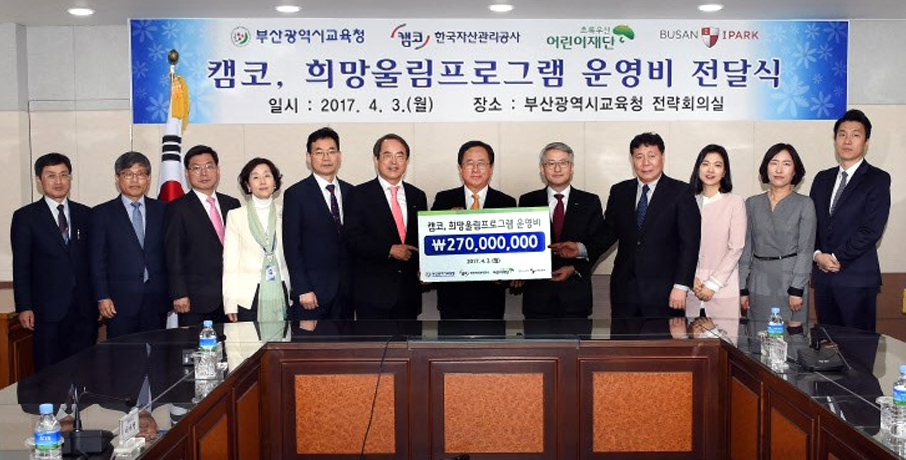 다양한 사회공헌 활동에 앞장서고 있는 캠코가 국민과 함께하는 따뜻한 나눔 문화 확산을 위한 새로운 프로젝트를 시작합니다. 특히 이번 사회공헌 활동은 2억 7천만 원의 운영비 지원과 부산광역시 교육청, 초록우산 어린이 재단, 부산 아이파크 프로축구단 등과 협업으로 모범적인 지역밀착형 사회공헌활동으로 주목받았습니다.