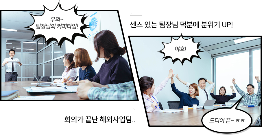 - 정말 잘 보셨어요~ 해외사업팀은 다른 부서들보다 역동적이에요. 캠코의 해외진출을 담당하고 있다 보니 아직 경험해보지 못한 새로운 사업들을 모색하고, 조사하고, 도전하는 일이 대부분이기 때문이죠. 매일 새로운 업무를 접하다 보니 더 파이팅 넘치는 팀이 된 것 같아요. 해외사업팀의 많은 자랑거리 중에 굳이 하나를 꼽자면 출중한 영어 실력이 아닐까요? 내부 보고 외에 대부분의 업무가 영어로 이루어지고 해외기관과의 업무협의가 많은 부서이기 때문에 해외사업팀원들은 모두 유창한 영어실력을 갖춰야 해요. 이미 모두 출중한 영어실력을 갖추었지만, 캠코 어학당이나 전화영어를 통해 아직도 꾸준히 영어 공부를 하고 있어요. 그래서인지 타부서에서 영어가 필요할 때면 항상 해외사업팀을 찾는 것 같아요.