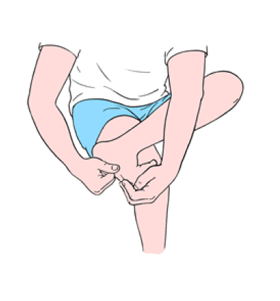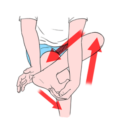 - 같은 쪽 손으로 발가락을 말아 쥐고, 발가락 관절이 위로 꺾이도록 발가락을 몸 쪽으로 당긴다.
