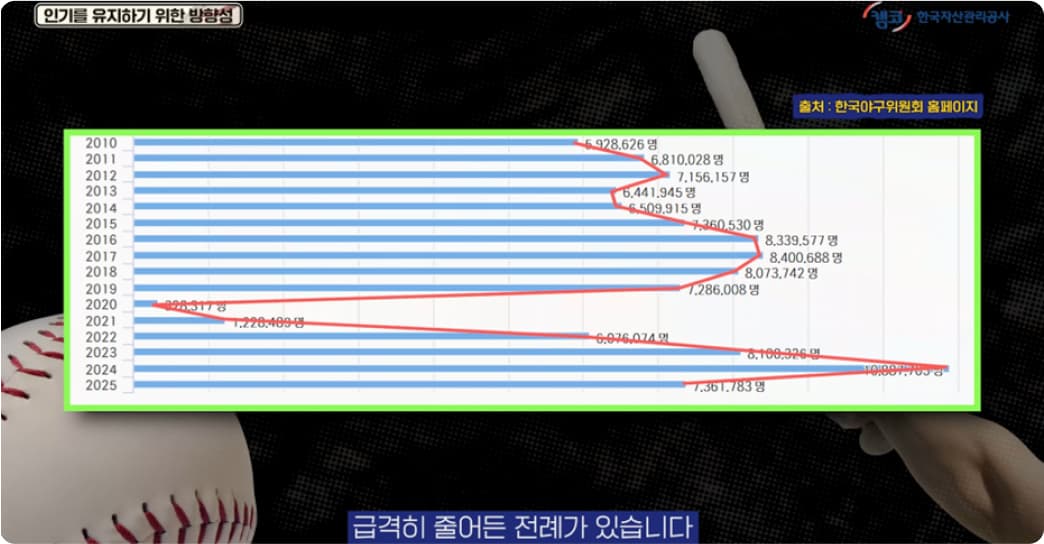 지금의 야구 인기는 유행에 의해 번지고 커진 측면이 분명히 있습니다. 유행이 식으면 인기도 떨어질 수 있다는 얘기겠죠? 실제로 2010년대 후반만 해도 계속해서 늘어날 것만 같던 관중 수가 급격히 줄어든 전례가 있습니다. KBO는 유행의 원인이 무엇인지 구체적으로 파악할 필요가 있겠습니다. 개인적으로는 이런 원인을 파악하는 과정에서 어떤 전문가 집단의 평가보다 더 다양한 팬들의 구체적인 이야기를 들어볼 수 있는 계기가 만들어지면 좋겠다는 생각을 합니다.