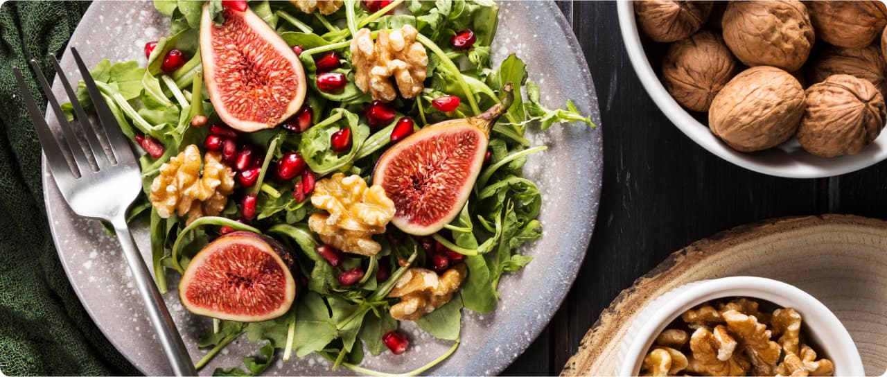 신선한 루꼴라 또는 혼합 그린 채소, 무화과 3~4개(반으로 자름), 호두 한 줌, 석류 씨 한 줌 올리브 오일 2큰술, 발사믹 식초 1큰술(선택 사항), 소금, 후추 약간