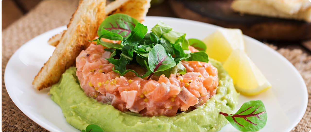 신선한 생연어(껍질과 뼈 제거한 것) 약 150~200g, 다진 양파 또는 샬롯 1큰술, 케이퍼 1큰술(선택 사항), 올리브 오일 1큰술, 레몬즙 1큰술, 다진 파슬리나 딜(선택 사항)아보카도 퓨레 재료